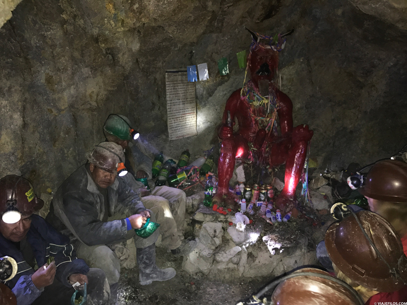 En tramos, la cosa se pone muy difícil y realmente nos arrepentimos de haber entrado. Llegamos hasta una oquedad donde se ofrenda al Tío (palabra en la que derivó el término “Dios” para los mineros indígenas de la época de la conquista española). La imagen que visitamos es el Tío Jorge, el mayor de la mina y que tiene 25 años. Representa al diablo, ante la dificultad que suponía trabajar en el Cerro. Se estima que en la época de máximo apogeo murieron hasta 8 millones de indígenas en tan sólo un siglo. La figura del diablo se introdujo para obligar al indígena a sacar más mineral, un modo de amenazarlo. En este sitio, charlamos un rato con tres mineros en su rato de descanso mientras mascan coca. Nos explican los sueldos, el sistema de cooperativas con el que funcionan, la dureza del trabajo. Realmente esto no es un teatro y esta gente no son actores. Sobre una hora y media más tarde salimos a cielo abierto ¡por fin!