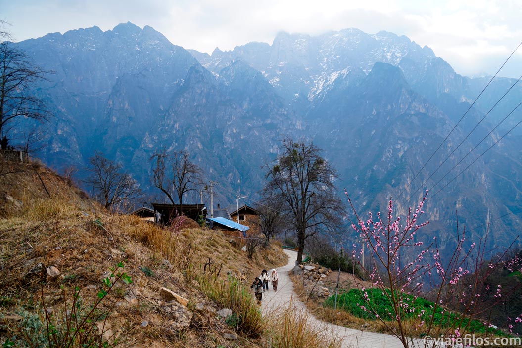 Tras unas dos horas el camino se bifurca. Puedes llegar a la casa del maestro Zhang o a Tina’s guest house. Parece que a la Tina le han levantado parte del negocio. Aun así, si vas a tomar el autobús hacia Shangri-la tendrás que desviarte hacia el Tina. Hasta aquí algún tramo más complicado tanto de subida como de bajada. A partir de aquí comienza la vegetación y el terreno siempre hacia abajo se convierte en más llevadero.