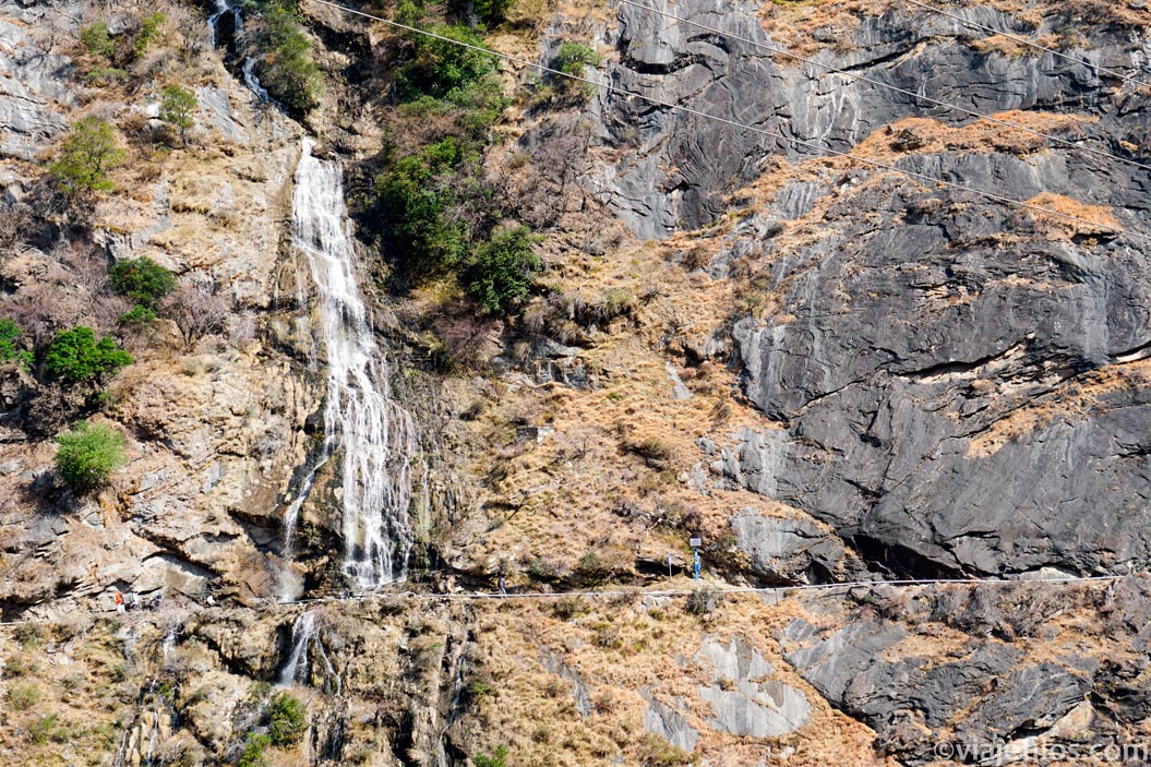 En una hora aproximadamente, llegamos al mirador Longdong, un sitio donde han puesto una cafetería. Como leéis, en medio de la graganta del Salto Del Tigre, una cafetería de lo más chic, estos chinos… Más adelante la catarata del mismo nombre. Aquí se acumula un poco más la gente que anda haciendo el sendero, nadie está dispuesto a renunciar a su foto. Si hay algo que nos está quedando claro en este viaje es que por una foto los turistas locales son capaces de todo. Con asomarse un poco a la garganta se entiende su nombre.