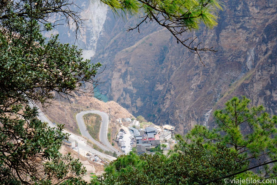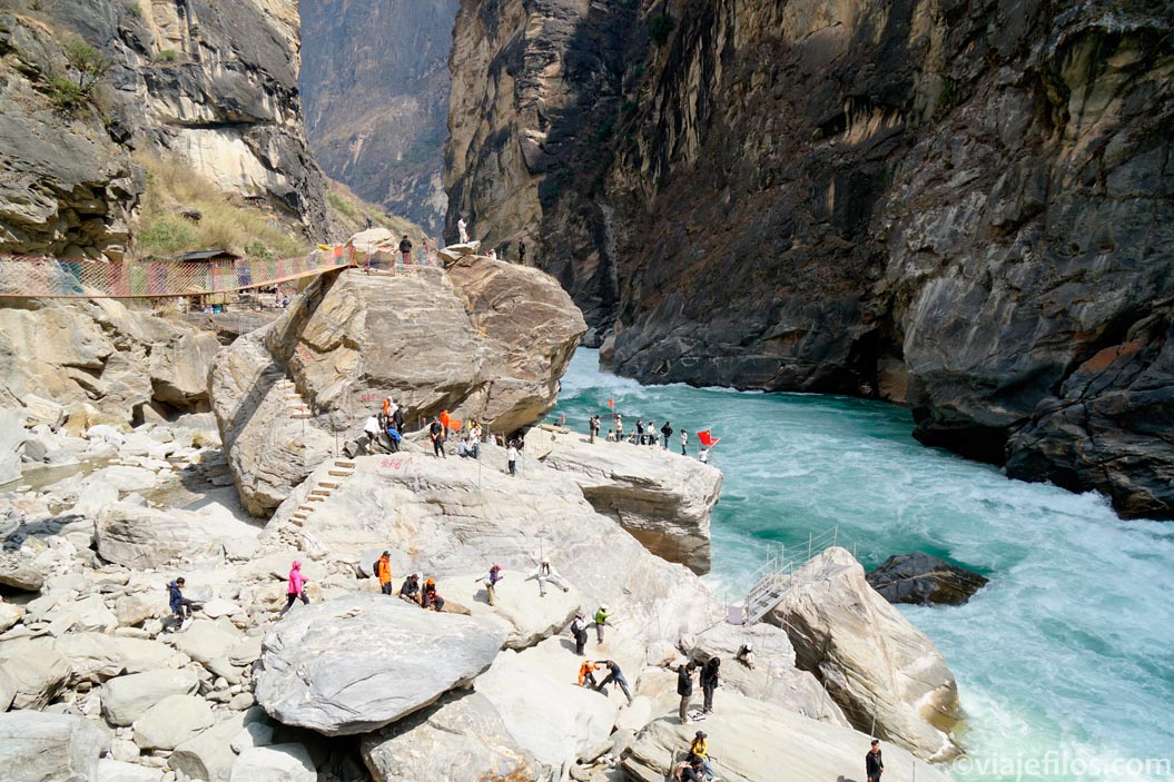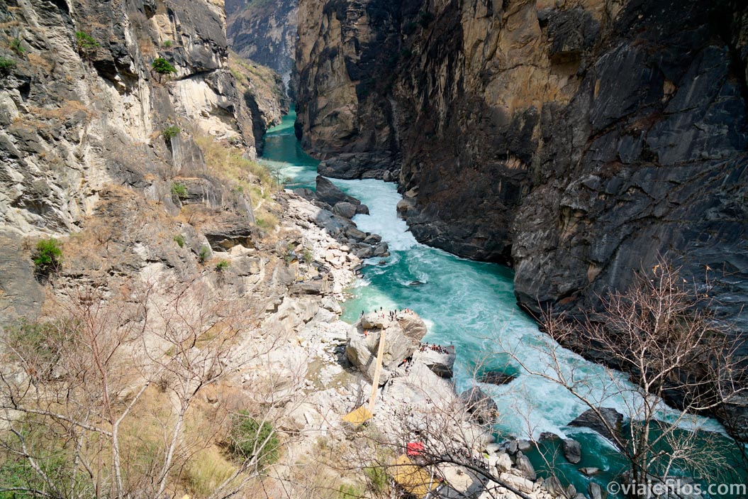 Comemos algo desde la guesthouse decidimos bajar al río antes de salir hacia Shangri-la. La distancia no parece demasiado pero el desnivel desde luego es brutal. Nos animamos al ver que casi todo el que llega hasta aquí baja para disfrutar del cañón desde el río. Aquí hay que inscribirse en una lista y pagar 15 yuanes (2 €).