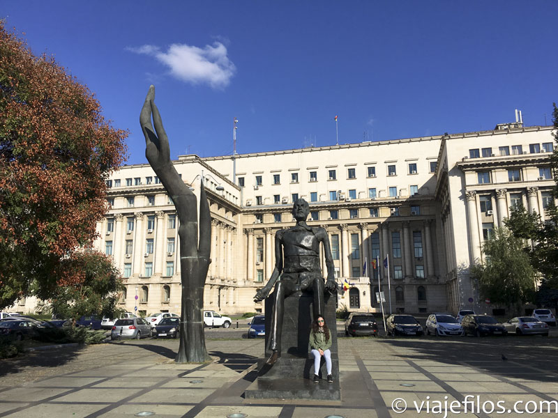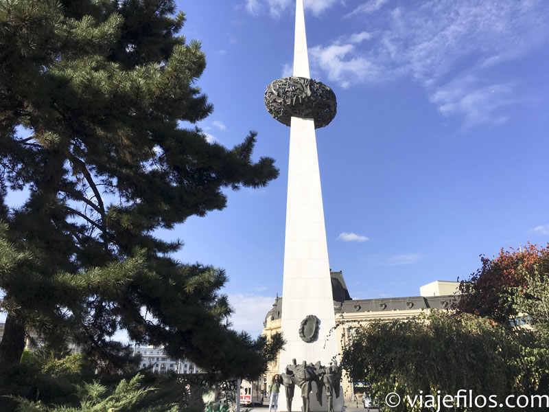 Justo frente a ella destaca la archiconocida Plaza Revolución, con el imponente edificio de la Oficina del Gobierno, famoso por sus columnas y por ser el lugar desde donde Ceaucescu daba sus mítines. En la memoria colectiva están las imágenes de sus últimos discursos con la plaza abarrotada. En uno de los extremos de la plaza destaca el monumento en recuerdo a los caídos en 1989, un imponente obelisco de 25 metros inagurado en 2005.