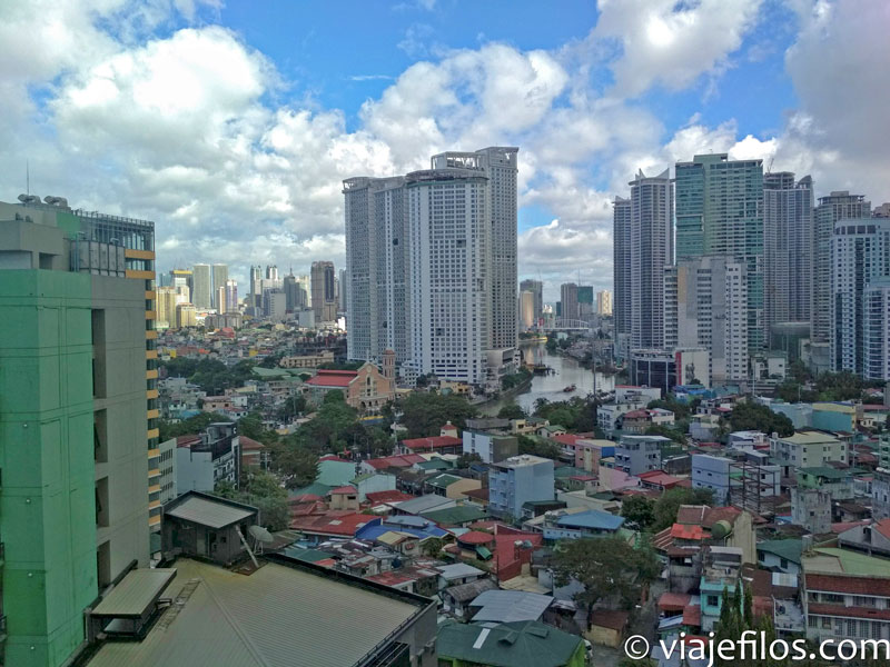 Volamos a Manila con Air Asia, sin incidencias excepto el retraso de 3 horas posiblemente por el tiempo tan tormentoso que hizo desde primeras horas de la mañana. Llegamos al aeropuerto de Manila y cogimos un taxi oficial (Metered taxi, hay amarillos y blancos) muy bien organizados por una persona que anota el número de taxi y el destino para control. Tras varios intentos del taxista de cobrar una tarifa fija con la excusa de que el abundante tráfico engordaría la factura del taxímetro (esto nunca es verdad y además los taxis son muy económicos) puso el taxímetro oficial y tras superar el caos circulatorio llegamos al hotel en 60 minutos situado en el distrito de Makati, pleno centro financiero, por menos de la mitad de lo que quería cobrarnos.
