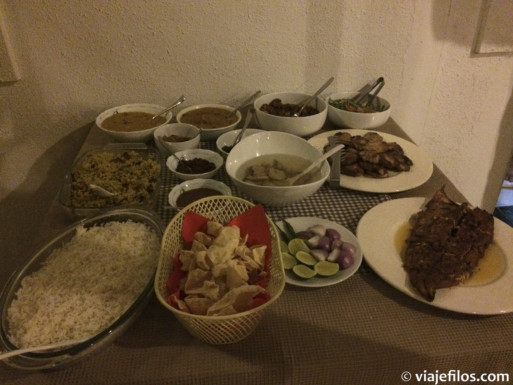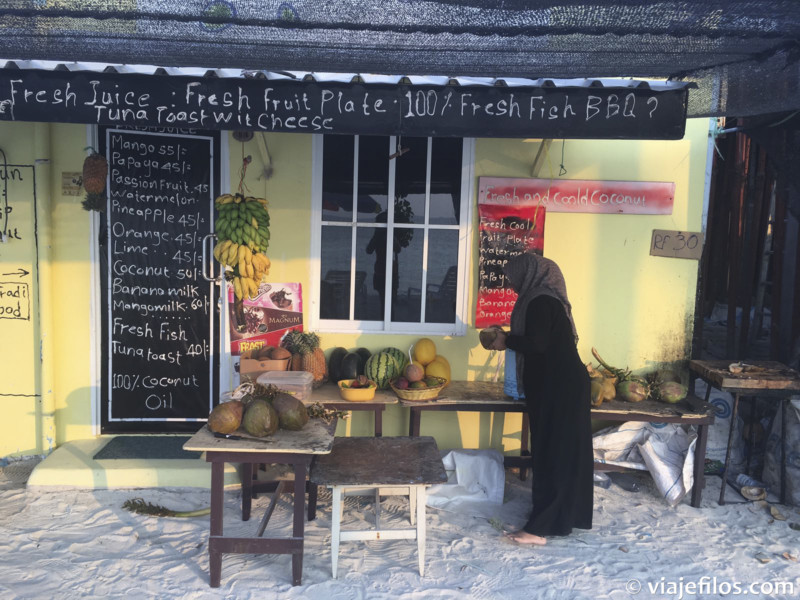 En el hostal pudimos disfrutar de desayunos locales (tostada, tortilla francesa y una mezcla de atún-cebolla-coco que se enrolla en pan tipo pita y se moja en una salsa) incluidos en el precio de la habitación. Una noche nos prepararon una cena maldiva, exquisita, por 15 usd/pers.
