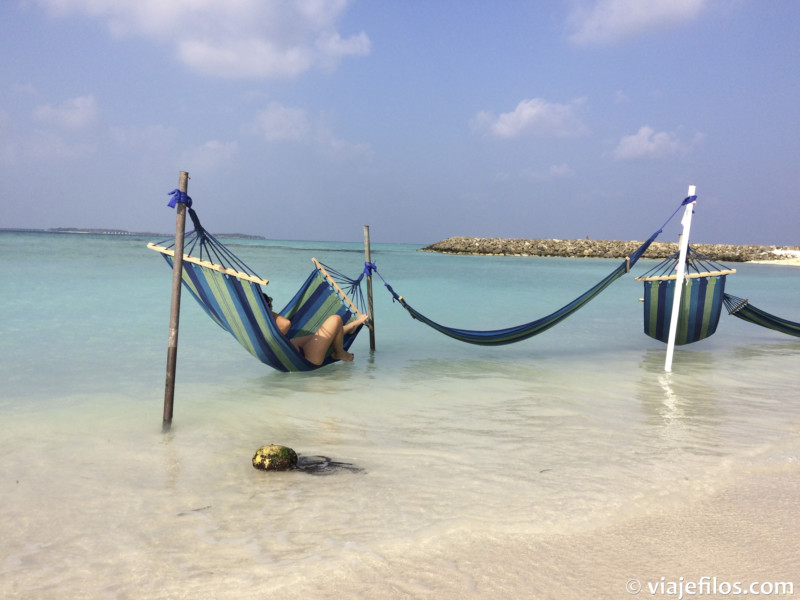 La isla de Maafushi, en el atolón Kaafu, tiene forma alargada y se recorre de punta a punta en unos 15 minutos a ritmo lento. En un extremo hay dos playas bikini, contiguas, una con más ambiente, tumbonas y palmeras y la otra más tranquila, con unas hamacas en el agua en las que sacarte unas estupendas fotos. A continuación, y ya más en el lateral de la isla, hay otra playa, non-bikini, bastante más grande y deshabitada. En las tres puedes hacer snorquel y ver bastante fauna marina (en esta playa vi mi primer tiburón, de unos 80cm de largo). Si el mar está en condiciones y si te encuentras en buena forma física, puedes nadar desde la playa a un islote, a unos 250m. Nos contaron que merece la pena el esfuerzo.