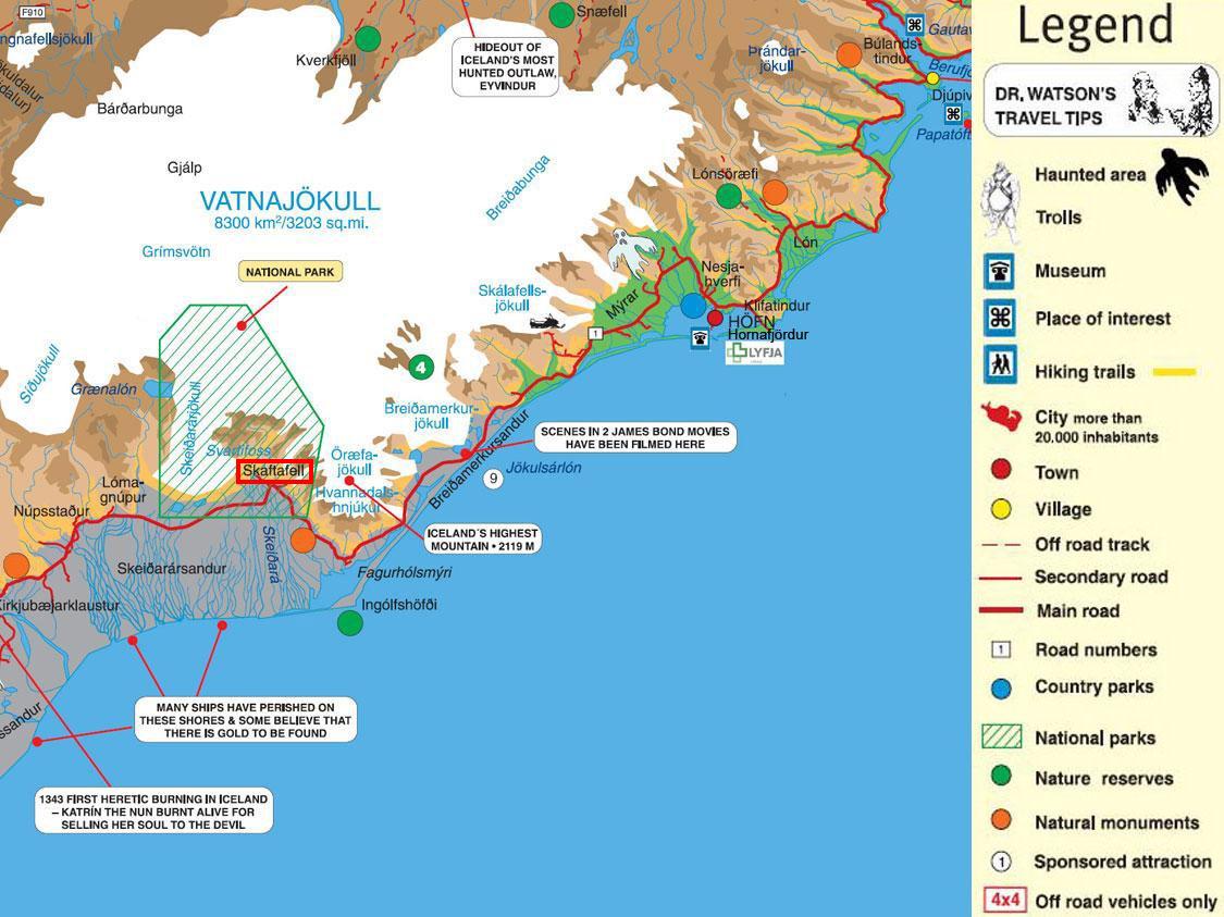 Este parque nacional es uno de los más grandes de Islandia y recientemente (2008) se ha unido a otros parques para formar el Parque Nacional de Vatnajökull. Localizado en su extremo suroeste, existen buenas carreteras para alcanzar el centro de visitantes, localizado a los pies del glaciar Skaftafellsjökull. En el centro de visitantes tenemos una pequeña cafetería donde podemos comer algo y a continuación una tienda donde podemos comprar libros, camisetas y mapas del parque (300 coronas el que os podéis descargar en la página del parque): www.vatnajokulsthjodgardur.is/english/hiking/skaftafell/)