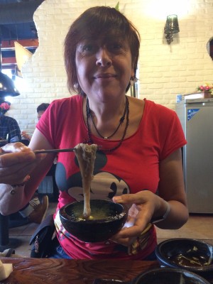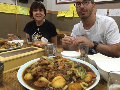 Es un guiso de pollo cocido con salsa de soja, vegetales y noodles (fideos) de arroz que tiene un toque picante. Es típico de la ciudad de Andong, y se puede degustar en los múltiples locales del centro. Nosotros elegimos uno de ellos al azar, donde todo estaba escrito en coreano, la camarera sólo hablaba coreano,…, pero a pesar de la incomunicación la cena salió a la perfección.