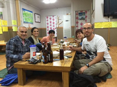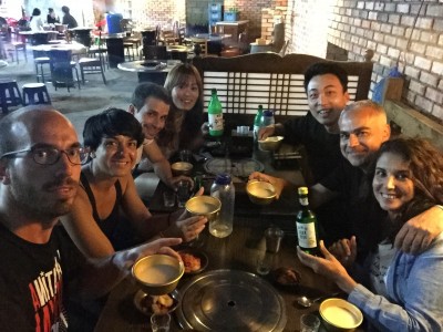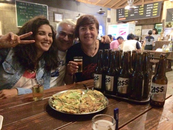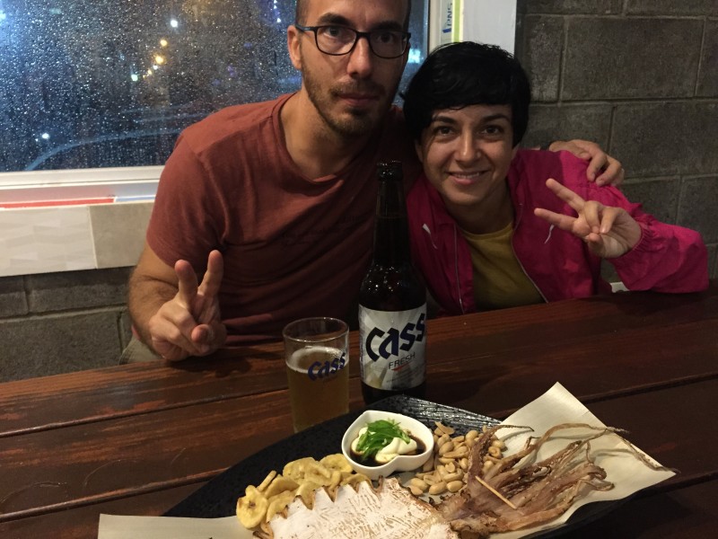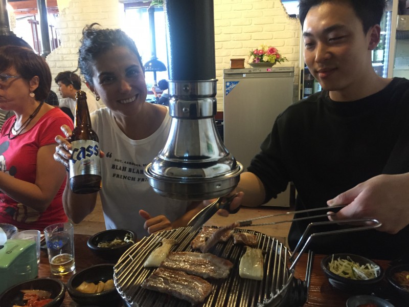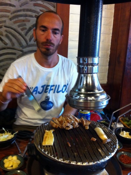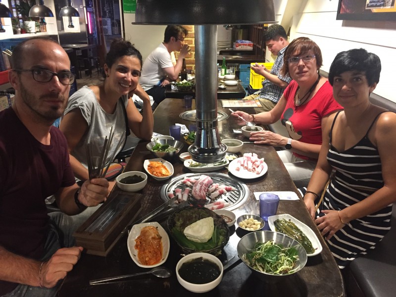 La barbacoa coreana fue lo primero que probamos al llegar a Seúl, para cenar, que es cuando la suelen comer los coreanos. Acompañados por nuestro amigo Tito, elegimos un local del animado barrio de Hongdae para dar buena cuenta del primero de muchos samgyeopsal, regado con unas cervezas Hite y un poco de soju (licor hecho a base de arroz).