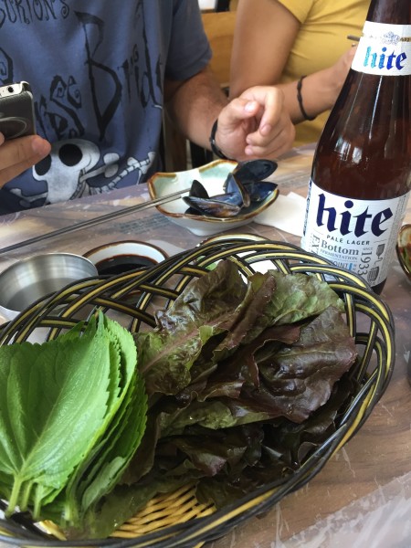 Solamente tendrás que elegir el tipo de carne y la cantidad y , a partir de ahí llevarán a tu mesa cuencos con pasta ssamjang, kimchi, ensaladas con brotes de soja, rabanitos encurtidos, ajos, pimientos verdes y grandes hojas de lechuga o de perilla. La pasta ssamjang nos encantó, y está elaborada a base de otros dos tipos de salsas, la de doenjang (que es un fermentado a base de granos de soja) y el gochujang (pasta hecha a base de guindillas). La carne en la parrilla se corta en pequeñas tiras , después se coloca en el centro de la hoja de lechuga o de perilla y se le añade todo lo que gustes de los cuenquitos con las guarniciones, pero, sobre todo, no olvides echarle la rica pasta ssamjang…Se hace un pequeño saco y, sin más, a saborear la mezcla que nunca defrauda.