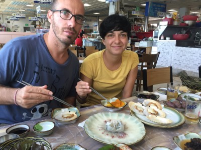 El hoe es el pescado crudo en coreano, el equivalente al sushi japonés, y que es muy típico en la ciudad costera de Busan, sobre todo ir a degustarlo el mercado del pescado de Jagalchi. Después de pasear y fotografiar los puestos, las mercancías, los vendedores,…, nos dirigimos a la primera planta del mercado a probar unos platos de hoe, unas gambitas y unas vieiras, condimentados con salsa de soja y unas cervezas Hite.