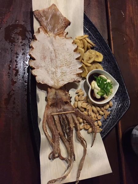Un plato muy curioso, elaborado a base de noodles (fideos) de color grisáceo en un caldo frío, literalmente, puesto que tenía bloques de hielo en su interior, con calabacín, sésamo y huevo cocido, entre otros. A pesar de que a la vista no resultaban nada apetecibles, he de decir que el sabor es realmente bueno.