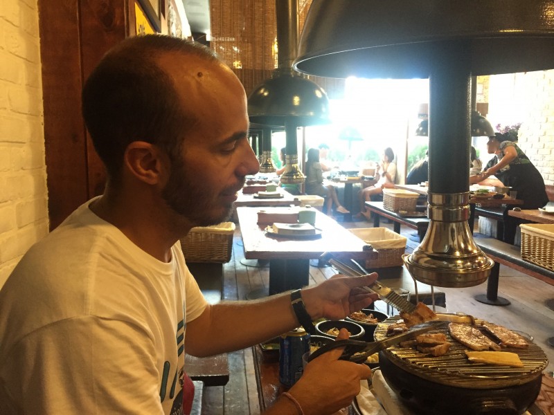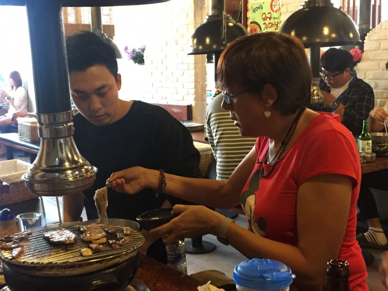 Un viaje a Corea estará incompleto si no te sientas a probar su barbacoa típica. Los locales que la sirven están repletos de mesas que tienen un agujero central en que se colocan las brasas en un recipiente y , sobre ellos, se pone la parrilla donde tú mismo cocinarás la carne, samgyeopsal, que significa panceta de cerdo. Sobre cada mesa hay un extractor de humos cilíndrico, que se ajusta en altura y que absorberá el humo de tu barbacoa.