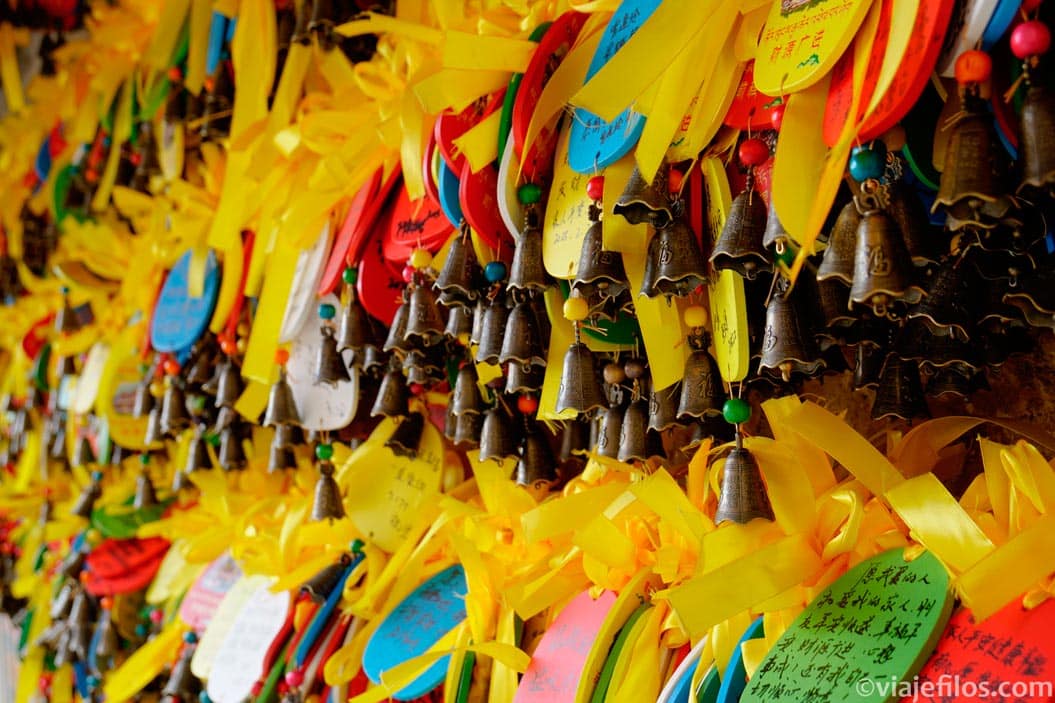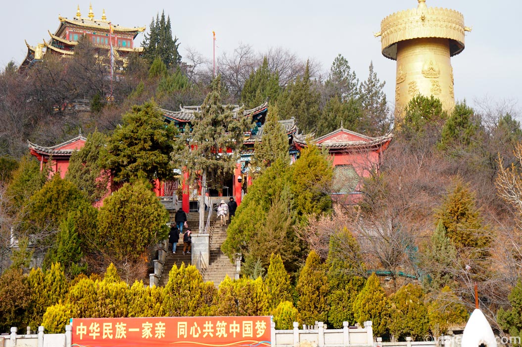 En la misma plaza tomamos un DiDi hasta el centro turístico que da acceso al enorme templo. Son unos 5 km y costó 14 yuanes (poco menos de 2 €). Abre entre las 8 y las 17 horas. La entrada cuesta 75 yuanes (10 €). No está permitido el tráfico en vehículos privados dentro del complejo y un bus turístico para subir al monasterio se incluye en el precio de la entrada. No se pueden hacer fotos en las salas de oración.