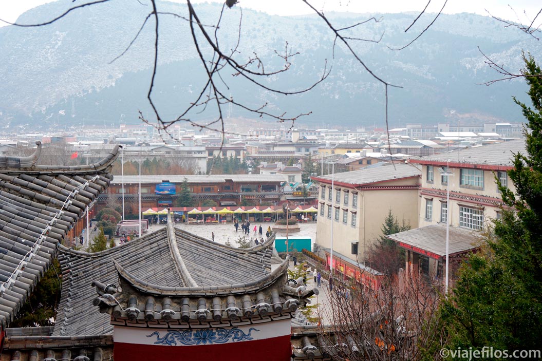 ¡Amanece y Shangri-La aparece cubierta por un manto de nieve!. Y desde el ventanal de nuestra habitación se disfruta de una panorámica de los tejados y los templos nevados sobresaliendo en el horizonte. Si bien nuestra primera impresión no fue la mejor, desde ese momento pensamos en quedarnos más tiempo. El pueblo no es grande pero tiene algunos parques nacionales alrededor con muy buena pinta. Además nos hubiera venido de lujo darle pausa al viaje por el sur de China en este punto. Relajarse creo que lo llaman…