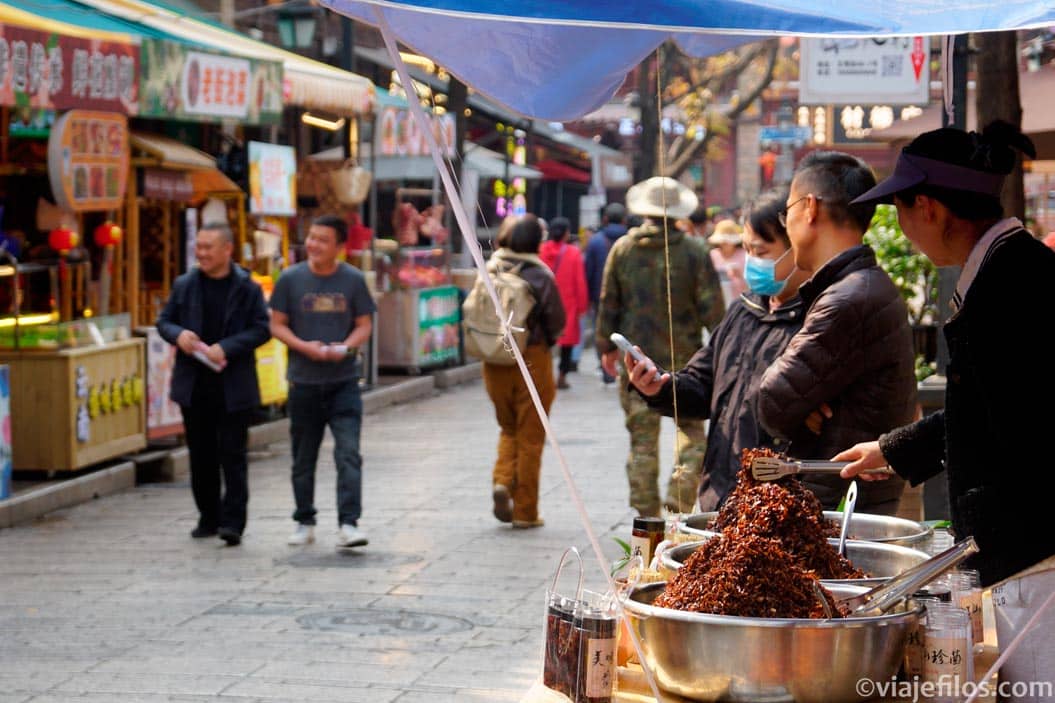 Nos abrimos paso entre grandes edificios hasta llegar a Jinmafang y las dos famosas puertas de la dinastía Ming: la Puerta del Caballo Dorado y la Puerta del Gallo de Jade. Se nos ha nublado el día y aún así son realmente bonitas. En cualquier momento parece que vas a cruzar una de las puertas y te vas a trasladar en el tiempo. La ciudad moderna ha dejado a su predecesora relegada a una pequeña plaza a tantos siglos de historia. Seguimos paseando por detrás, entre tiendas de supuesta artesanía, el concepto made in China no puede estar más presente.