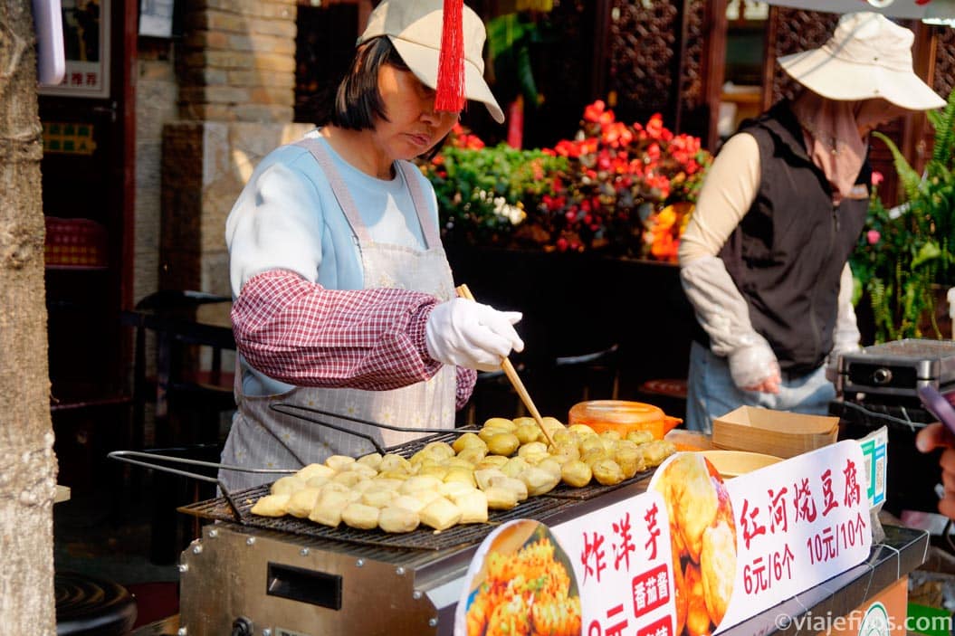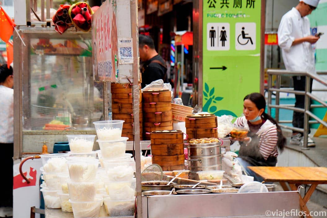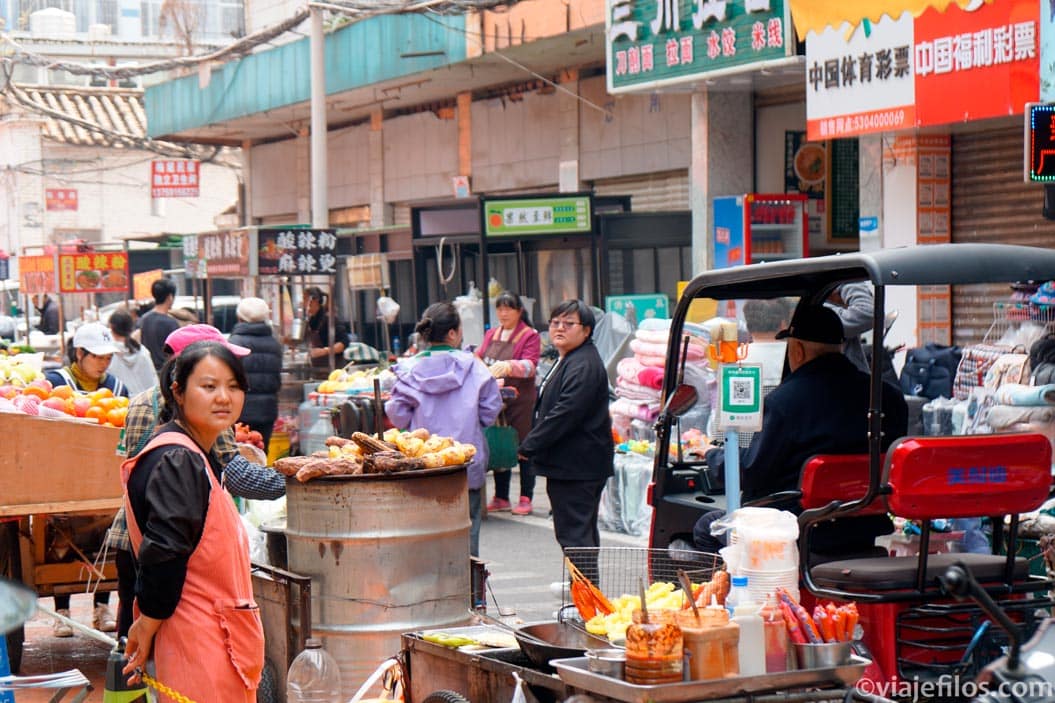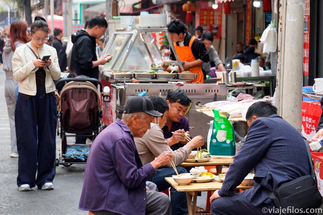 Los pies nos llevan sin rumbo hasta un callejón donde se ha hecho la hora de comer y todos los puestos se ocupan. Buscad Yukesi St a esa hora, os volveréis locos con la fotografía. Cerca la mezquita Yongning. Por cierto nos sorprendió la gran cantidad de población musulmana, creíamos que se concentraban en el norte del país.
