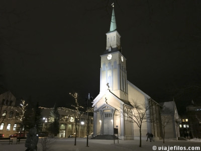 A unos 200 metros escasos, ya nos encontramos con la verdadera catedral de Tromsø (Tromsø Domkirke). Es la única catedral de Noruega hecha de madera. Es una catedral protestante construida en 1861 por el arquitecto Christian Heinrich Groch, en estilo neogótico. Se localiza en el centro de la ciudad, donde estuvo la primera iglesia, una capilla real construida por órdenes de Haakon IV en 1252. Ubicada en el centro del Kirkeparken (parque de la iglesia), un área verde que funcionó como cementerio desde la Edad Media hasta la primera mitad del siglo XIX. La catedral tiene planta de cruz con una sola torre con reloj en el centro de la fachada occidental, donde está la puerta principal.