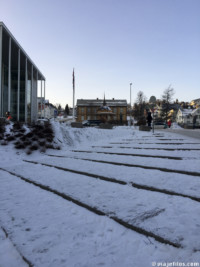 Tras el Polaria y el Polstjerna, paseamos por el puerto hasta llegar la plaza Torget (plaza principal) desde donde nace la calle Storgata en su tramo peatonal. En la parte más cercana al puerto se encuentra la estatua llamada Fangstmonument (cazador del ártico), obra de Sirvet Donali que muestra a un ballenero en un bote, armado con su arpón. Si nos vamos alejando del puerto, llegamos a una zona más amplia de la plaza en la que ese día se estaba celebrando la fiesta del pueblo Saami, ya que el 6 de febrero es el día nacional Saami en conmemoración de la fecha de la primera conferencia de dicho pueblo. La plaza estaba repleta de puestecillos con ropa típica de piel de reno, puestos de comida casera (nos quedamos con ganas de probar la sopa de reno), había un Lavvu (cabaña circular tradicional del pueblo Saami).