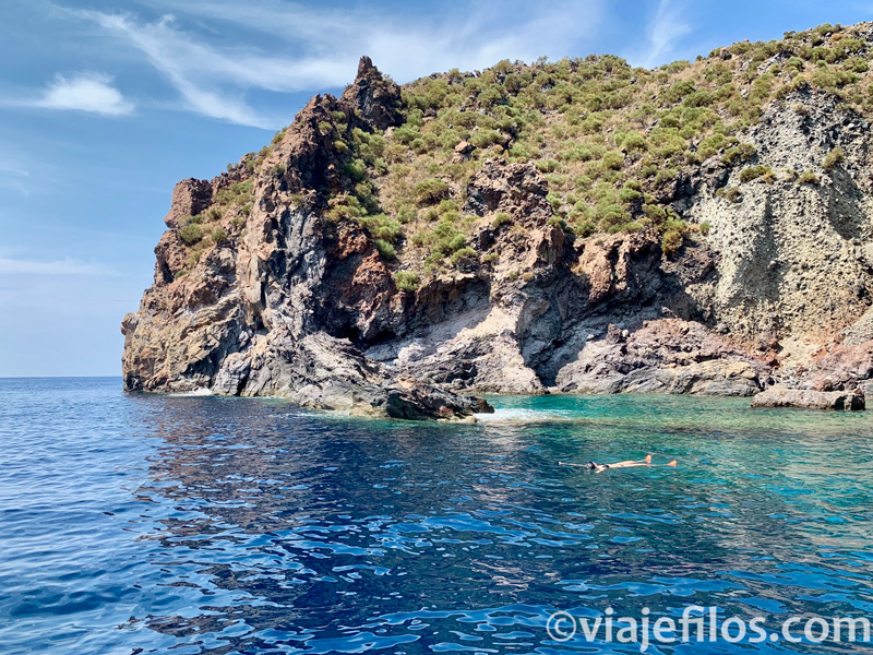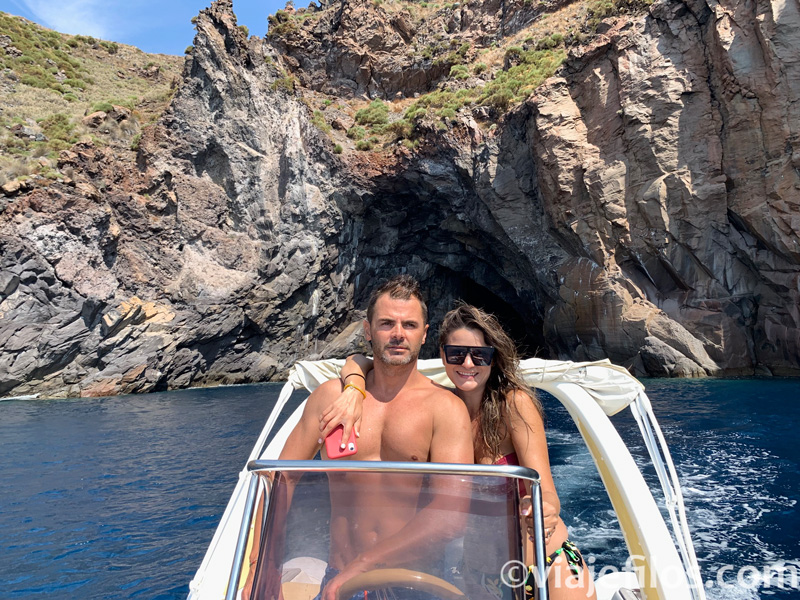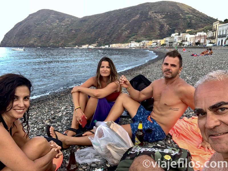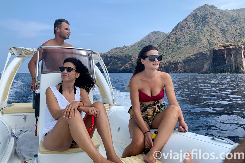 Tras unas primeras 24 horas desanimados por las tormentas que amenazaban con fastidiar nuestro viaje, amaneció por fin un día soleado. Nos vinimos arriba y decidimos alquilar un bote para un día completo y así circunnavegar Lípari y Vulcano. La barca incluía por deferencia del arrendador una pequeña nevera con hielo que no tardamos en llenar con algunos botellines de Messina. Y así pasó el día, entre cala y cala aprovechando las paradas para un baño aquí, otro allá y sirviéndose de la buena cerveza para refrescarnos. ¿Os imagináis? Tomar una fría birra siciliana al pie de uno de estos volcanes…