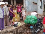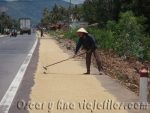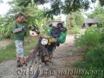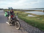 Al día siguiente tocaba una etapa dura, muchos kms (para recuperar) y mucho calor por delante. La moto bien, hasta que quiso lo contrario. Gripo el freno trasero! No hay problema, llamo al RACE, cuatro gritos y dos casas más adelante hay una casa taller. Cogemos el coche de asistencia (su moto y 4 llaves en la mano) y empujamos la Minsk hasta una sombra. En 10 min la moto estaba perfecta y unos 80 céntimos tenían la culpa. Ana seguía haciendo sus clases intensivas de vietnamita en la casa de unos lugareños de al lado. Cuando me acerque a recogerla, tenía una sillita a la sombra y una botella de agua bien fresquita, se maneja muy bien.