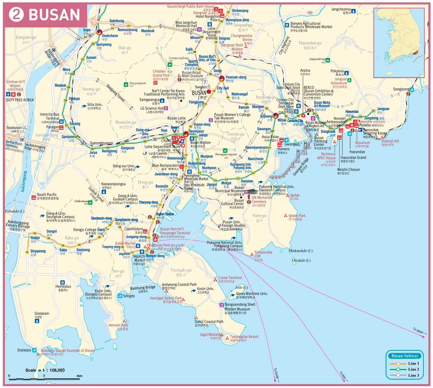 Una enorme Ciudad abierta al mar y conocida entre otras cosas por tener las playas más concurridas del país. Nuestro primer contacto anoche nos hacía pensar que nos gustaría pero solo teníamos las próximas 24 horas para visitarla, poco tal vez… Pero con la idea de aprovechar bien el día, nos tiramos a la calle a primera hora. La idea, recorrer la famosa playa de Haeundae, llegar hasta el templo de Haedong Yonggungsa, construido junto al mar y visitar el Mercado de pescado de Jagalchi, como mínimo… Si por el camino visitábamos alguno mas de los atractivos de la ciudad, ¡pues mucho mejor!