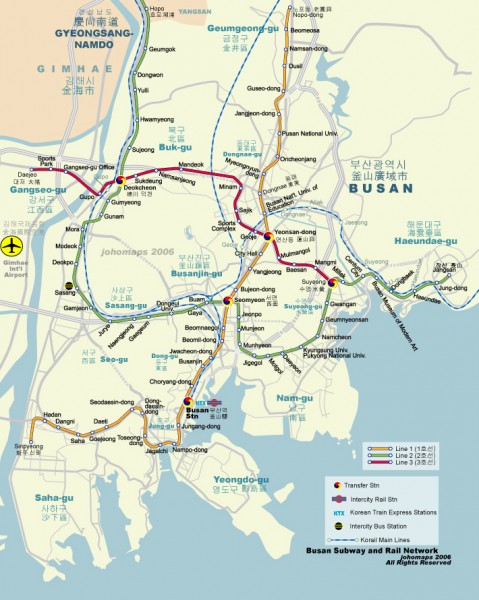 De nuevo en el Empathy, recogemos las mochilas y salimos hacia Busan. Por los pelos y tras un par de carreras por el metro, conseguimos coger el bus de las 17 horas. Su precio 9700 Wones para recorrer los 101 km que separan ambas ciudades. Una hora y cuarto hasta la Terminal Norte de Bus conectada con el centro con la línea 1 (su última parada)