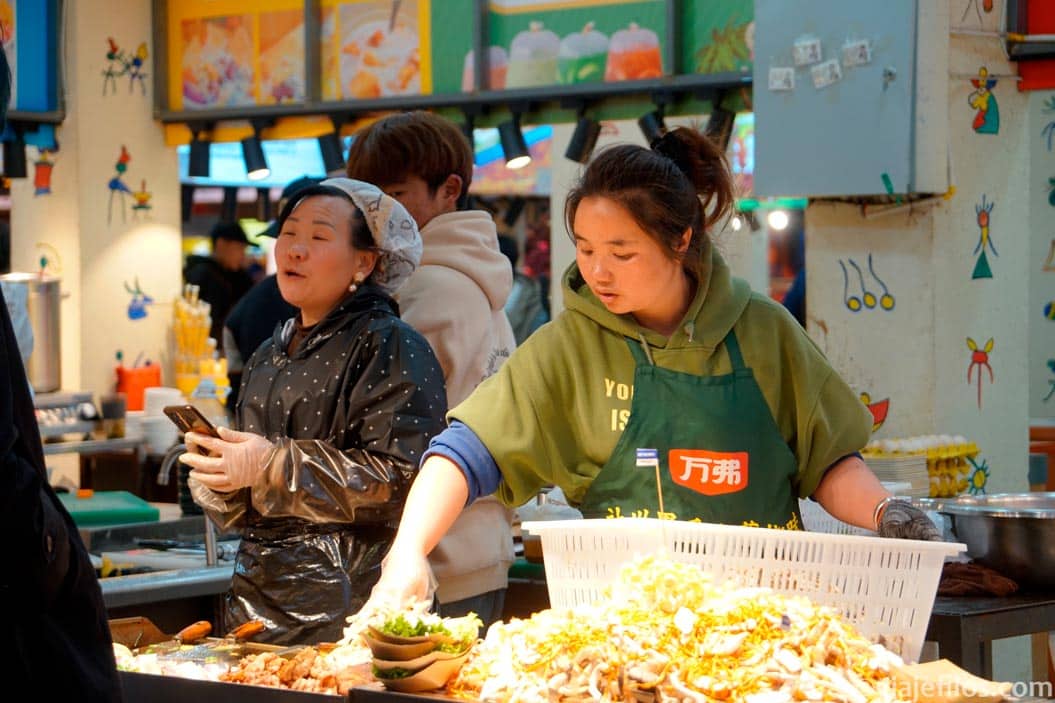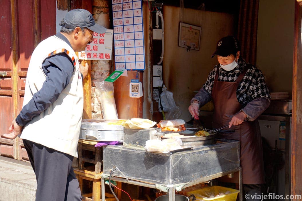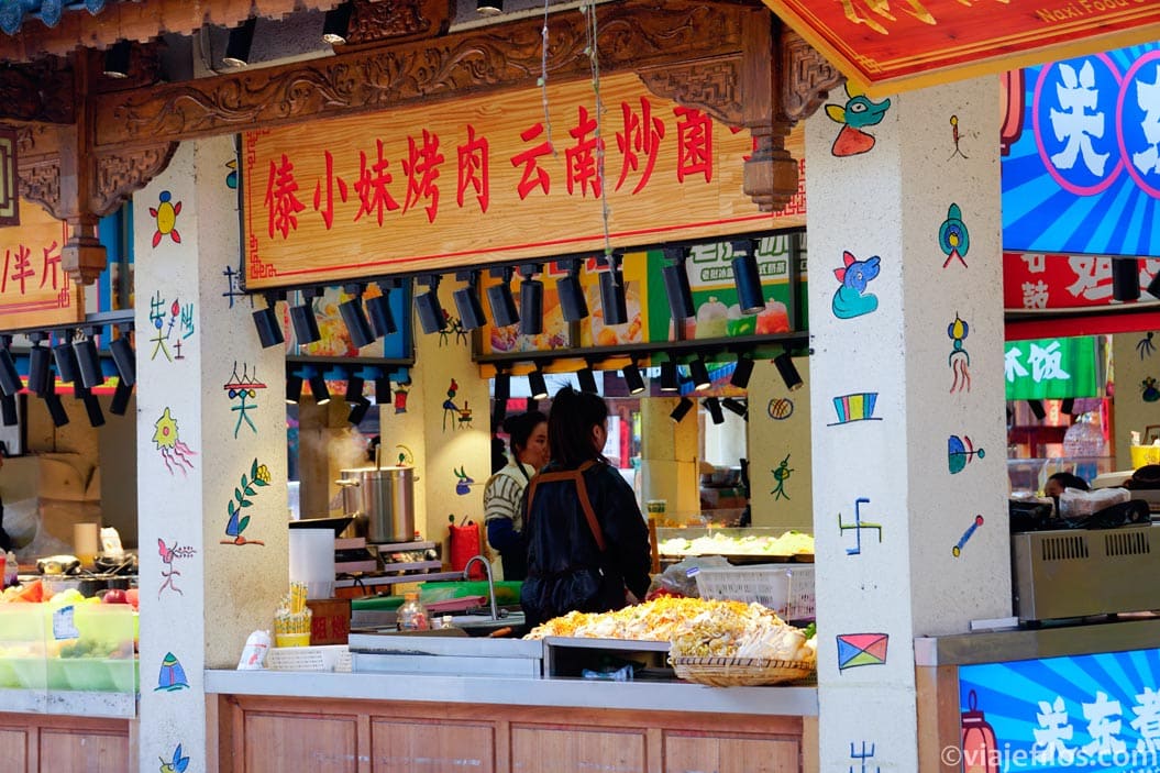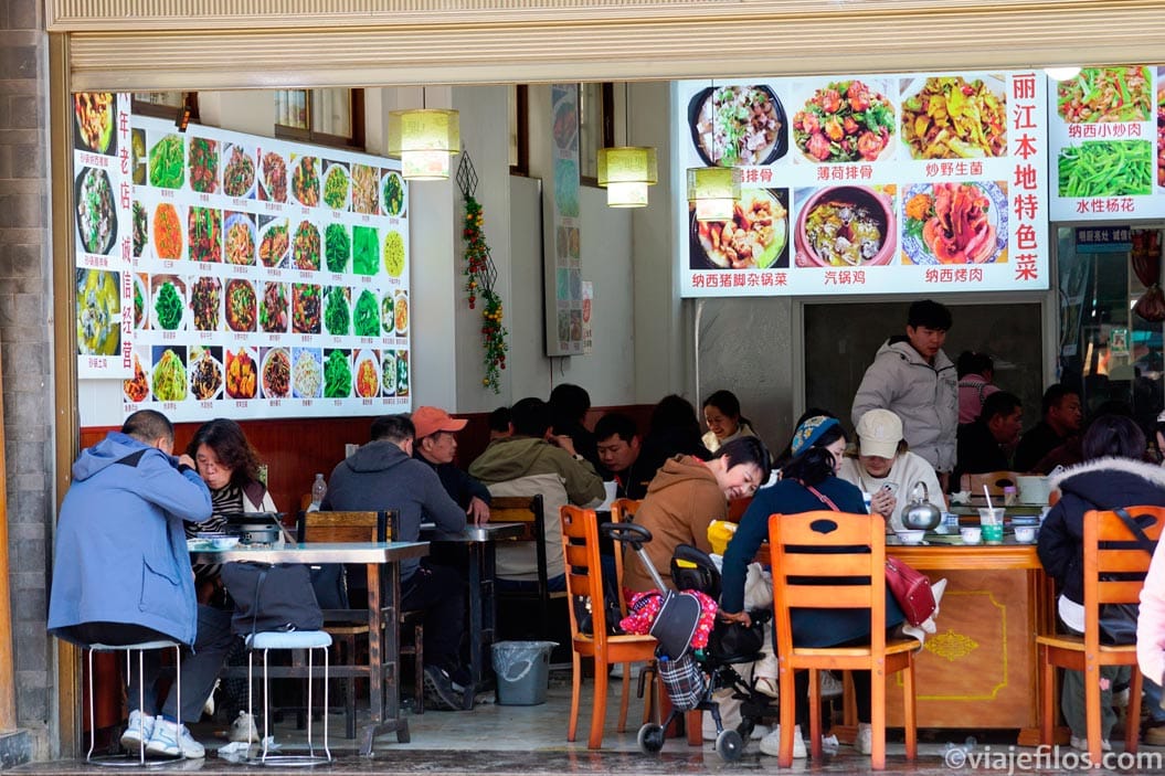 Para comer las posibilidades son tantas que se complica. Al igual que en el resto de China hay que añadir el problema del idioma y que las cartas en inglés son escasas. Optamos por una especie de patio abierto con muchos puestos donde por señas elegías y veías lo que te cocinaban. Además contamos con la ayuda de una muchacha que se prestó a traducir alguna cosa. Unas enormes raciones de noodels con setas de Lijiang muy ricas. Con cerveza no pagamos más de 4 € cada uno y creemos que nos hizo precio guiri…