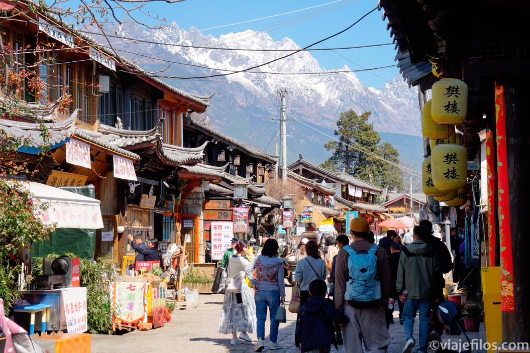 Baisha fue la antigua capital del Reino Naxi. A priori menos turistas pero solo a priori. Lo que sí es verdad es que las fotos con la montaña nevada de fondo son irresistibles. Para las mejores fotos tendrás que subir a alguna de las terrazas de los bares que hay en la calle principal y es difícil escaparse de tomar alguna cosa.