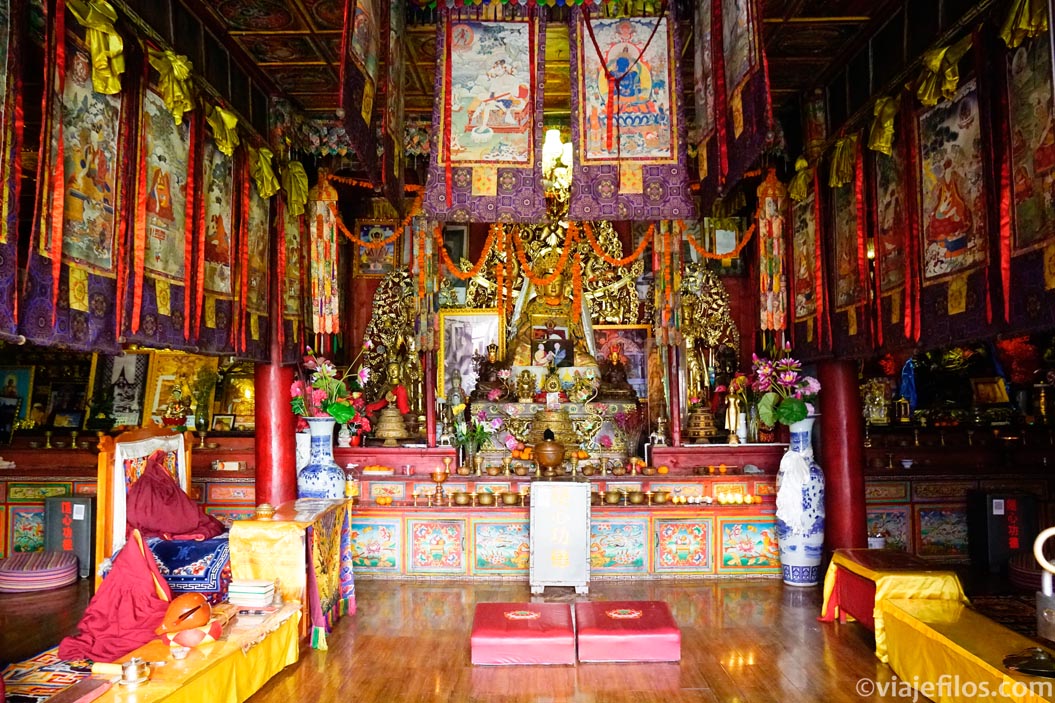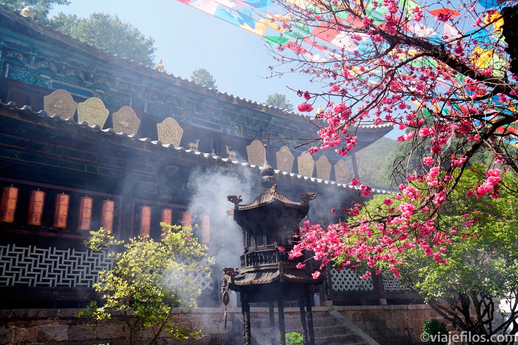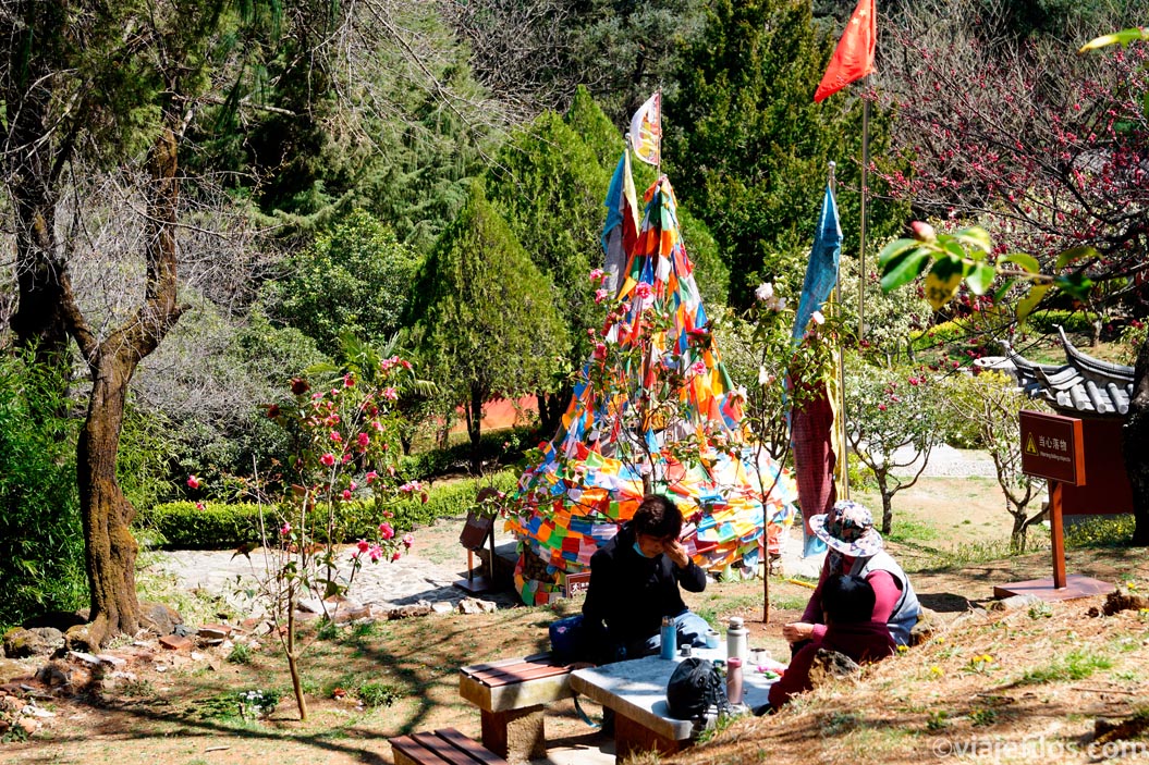 Un templo budista tibetano enclavado en un entorno natural precioso en el que pagamos 17 yuanes (2 €) cada uno para ver si teníamos suerte con el magnolio centenario que florece cada primavera. Era pronto para ello.