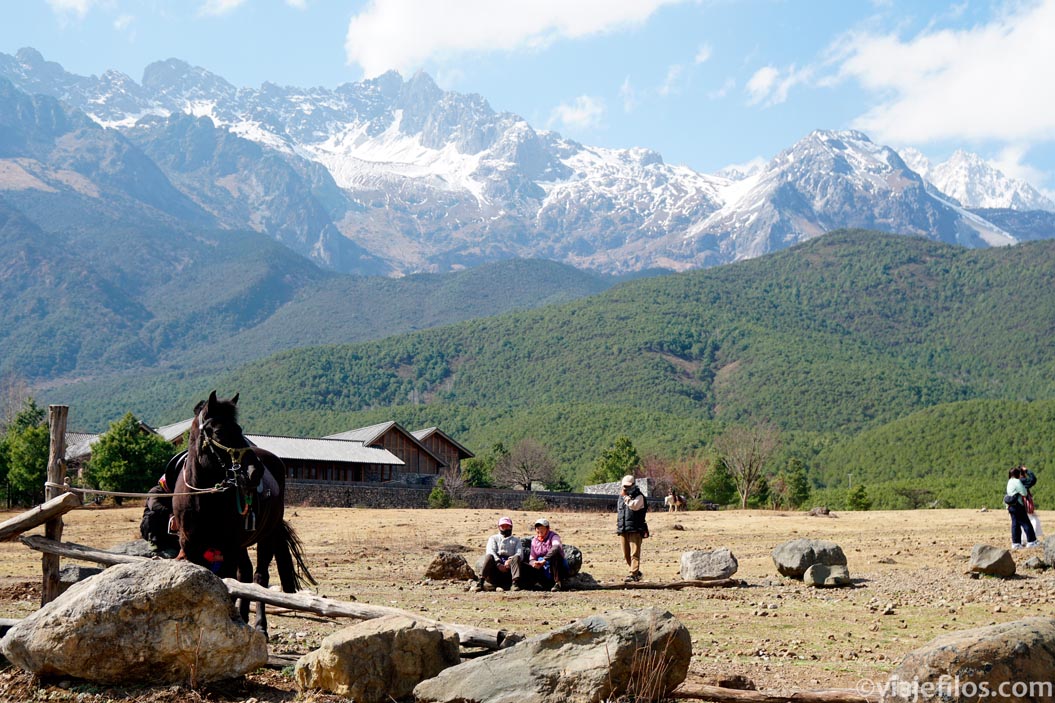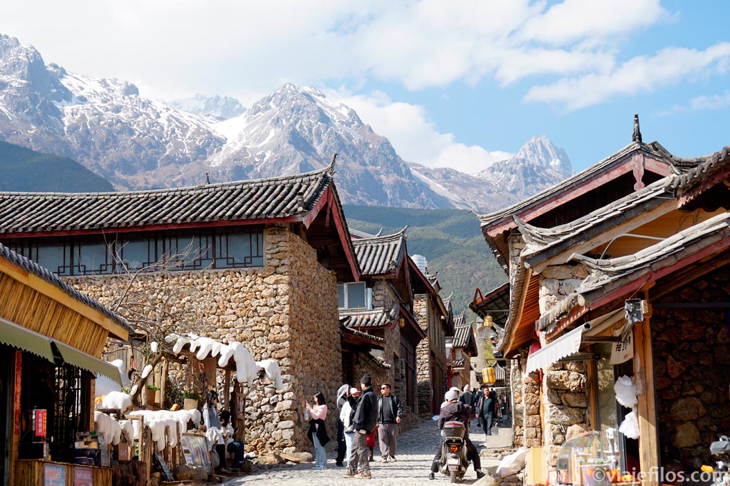 Y arriba, en el pueblo, justo lo que nos temíamos: restaurantes, tiendas y muy poco rastro de lo que debió ser una tranquila aldea al pie de la montaña nevada de Jade. Es lo más cerca que estuvimos en la montaña.
